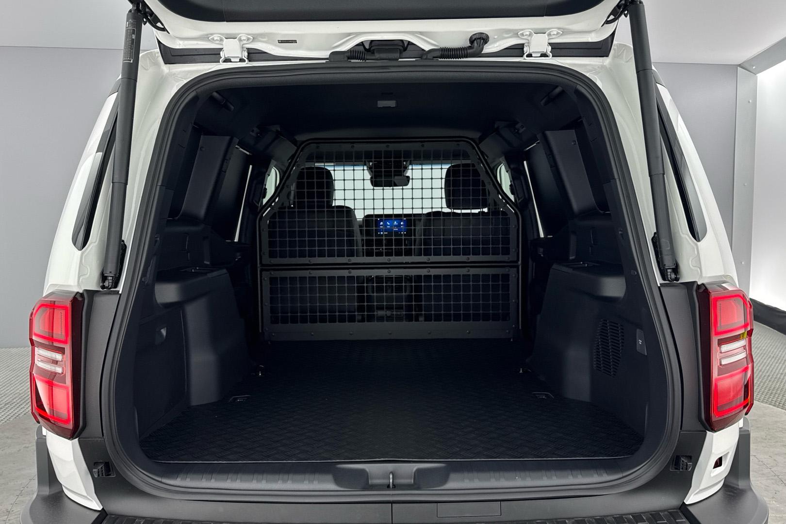 Toyota UK has removed the Prado’s second and third rows, and fitted a hard-wearing flat load floor. A full-height metal bulkhead with mesh grille separates the front seats from the cargo carrying space, and, as per regulations, the rear passenger windows are blacked out with covers.