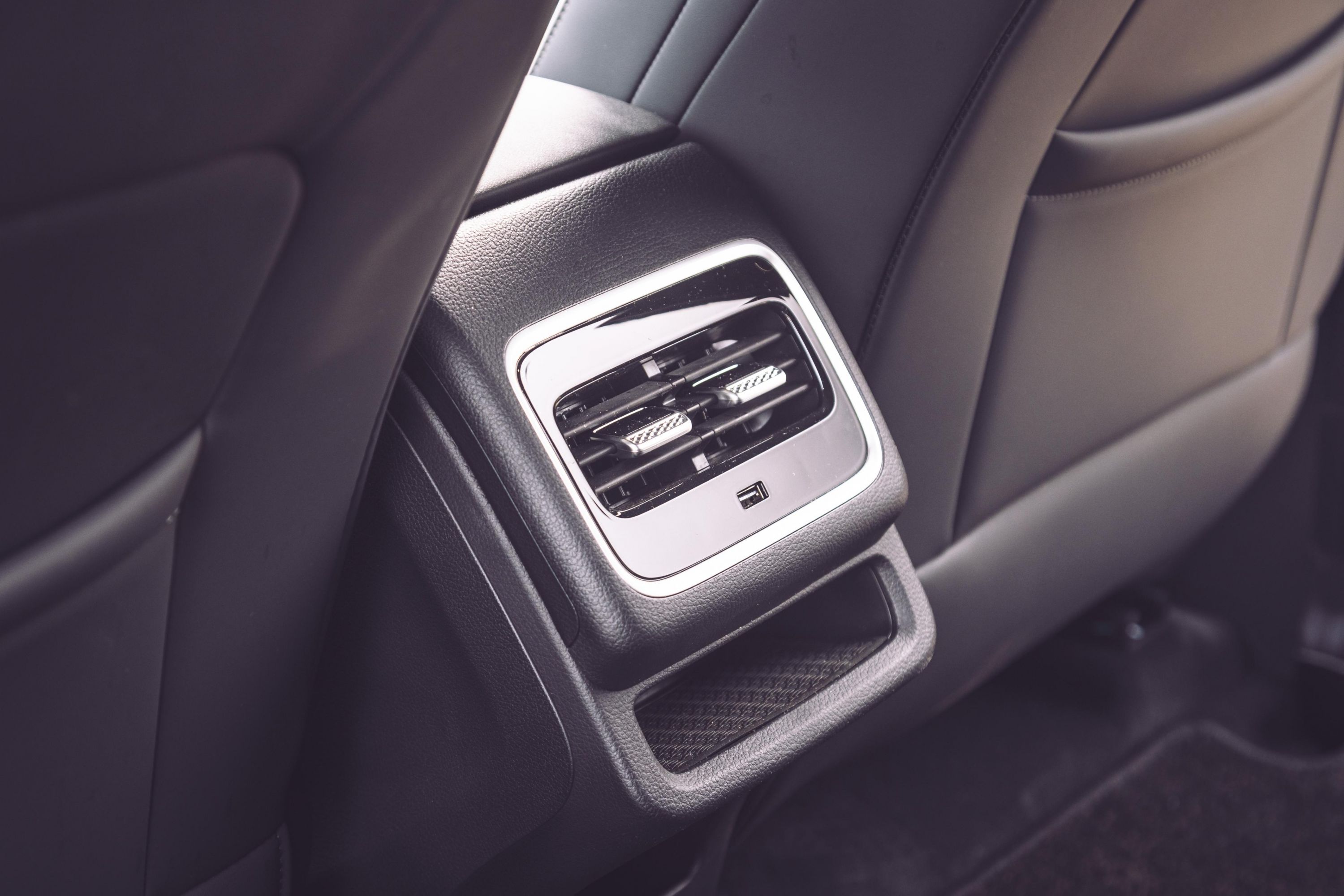 You’ll find rear-facing air vents on the back of the centre console, along with a single, subtle USB-A port and a shallow slot below. This panel is finished in piano black plastic, which will almost certainly get scratched to bits by kids trying to plug in cables.