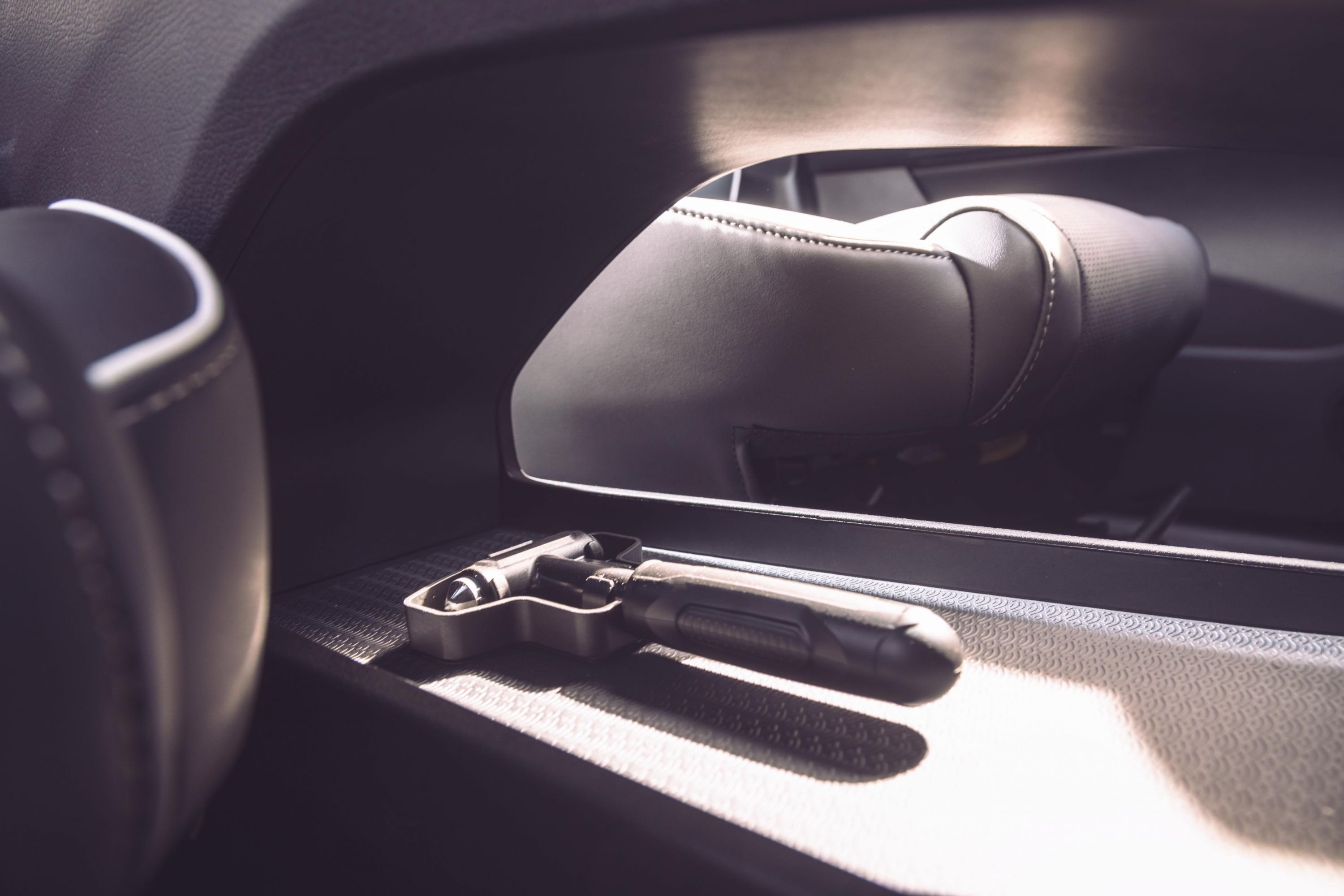 There’s also an additional storage tray underneath the centre console bridge, which – curiously – is where we found an emergency window-breaking hammer, much like what you’d find in a bus.