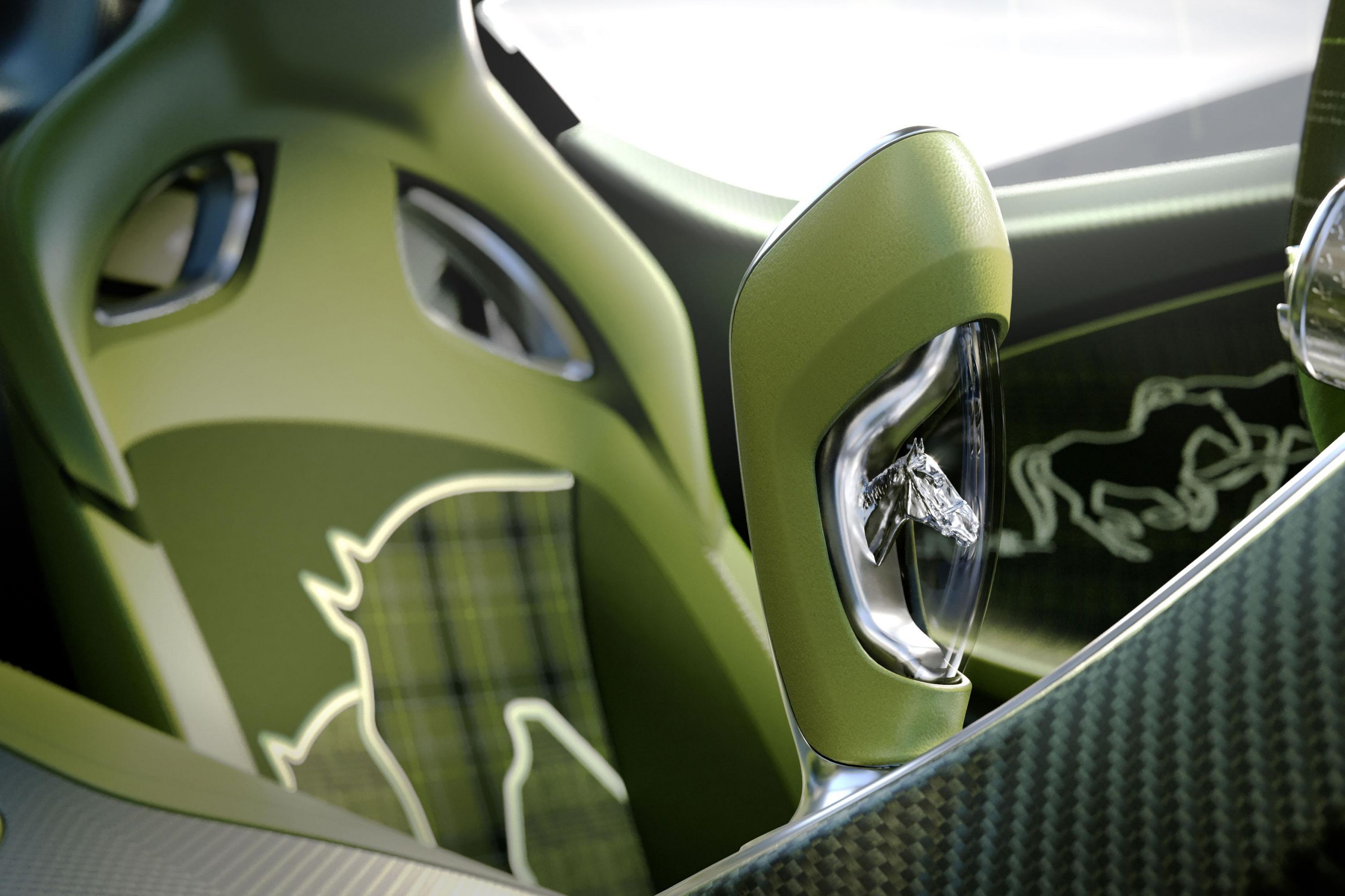 Green is also used extensively throughout the cabin, where a two-tone green scheme that’s certainly eye-catching and different. In a further nod to the car’s equine theme, the horses on the seats have a tartan pattern.