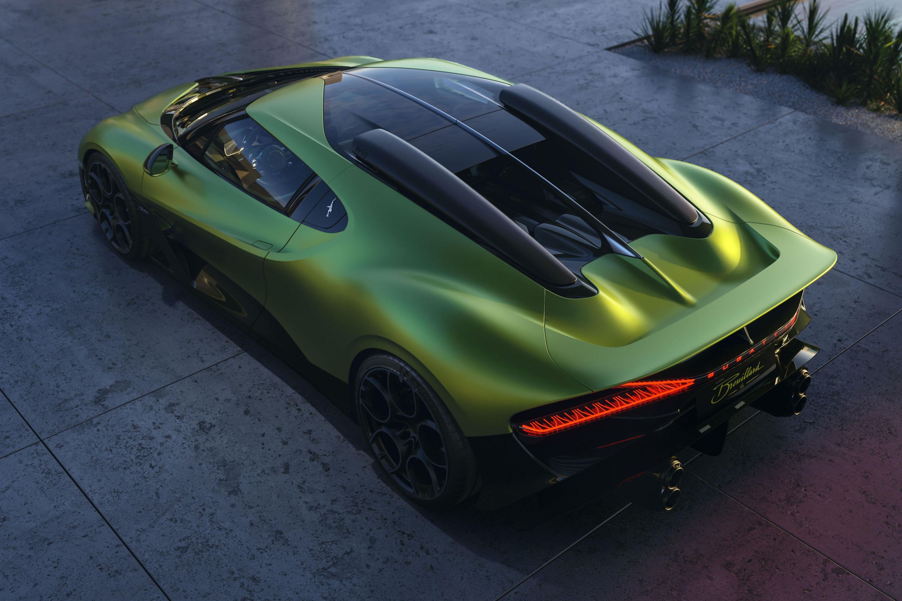 In the Brouillard case, this is carried over from the Mistral, so behind the passenger cell is a 8.0-litre quad-turbo W16 making 1176kW or 1600 metric horsepower, and 1600Nm. It drives all four wheels via a seven-speed dual-clutch transmission.