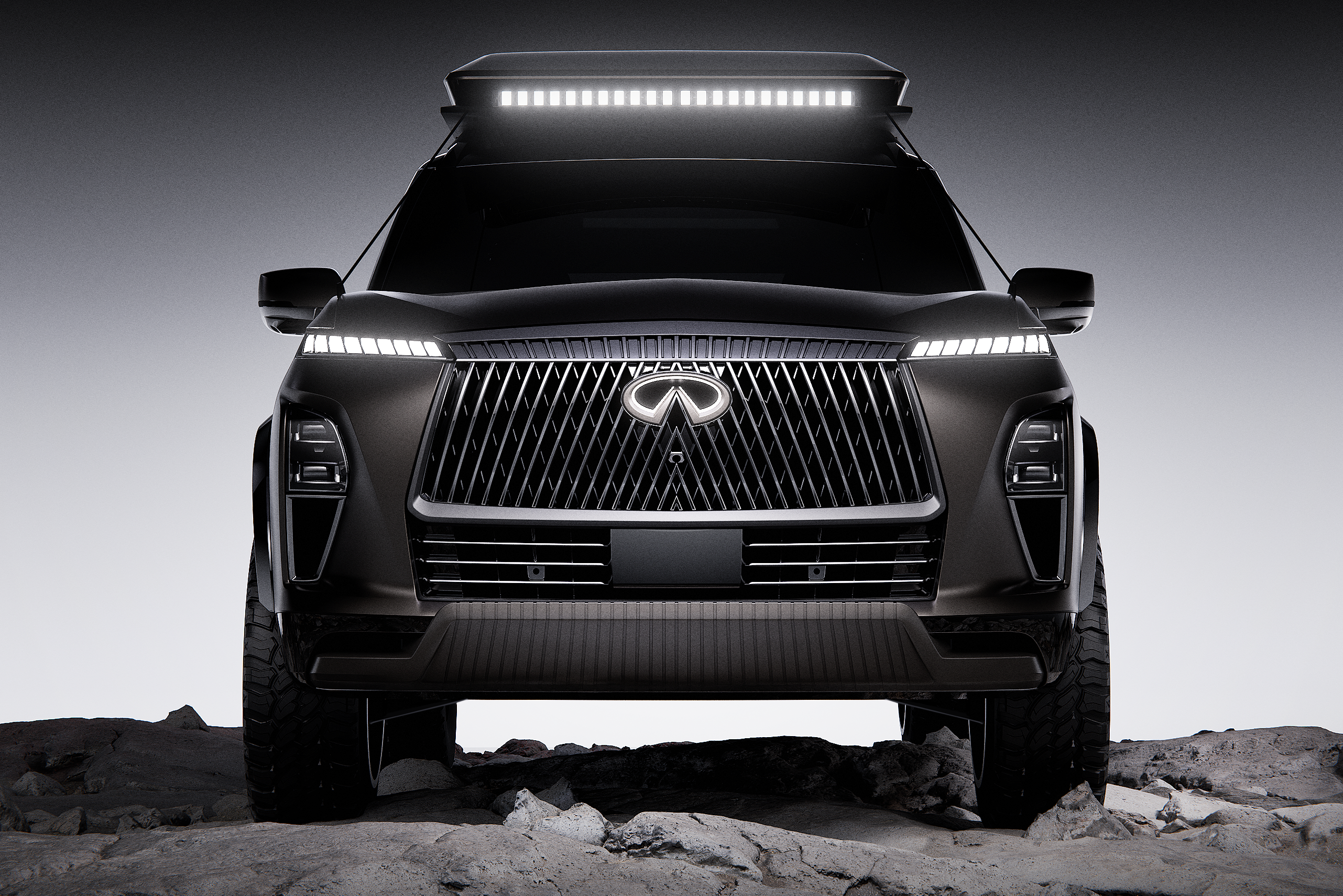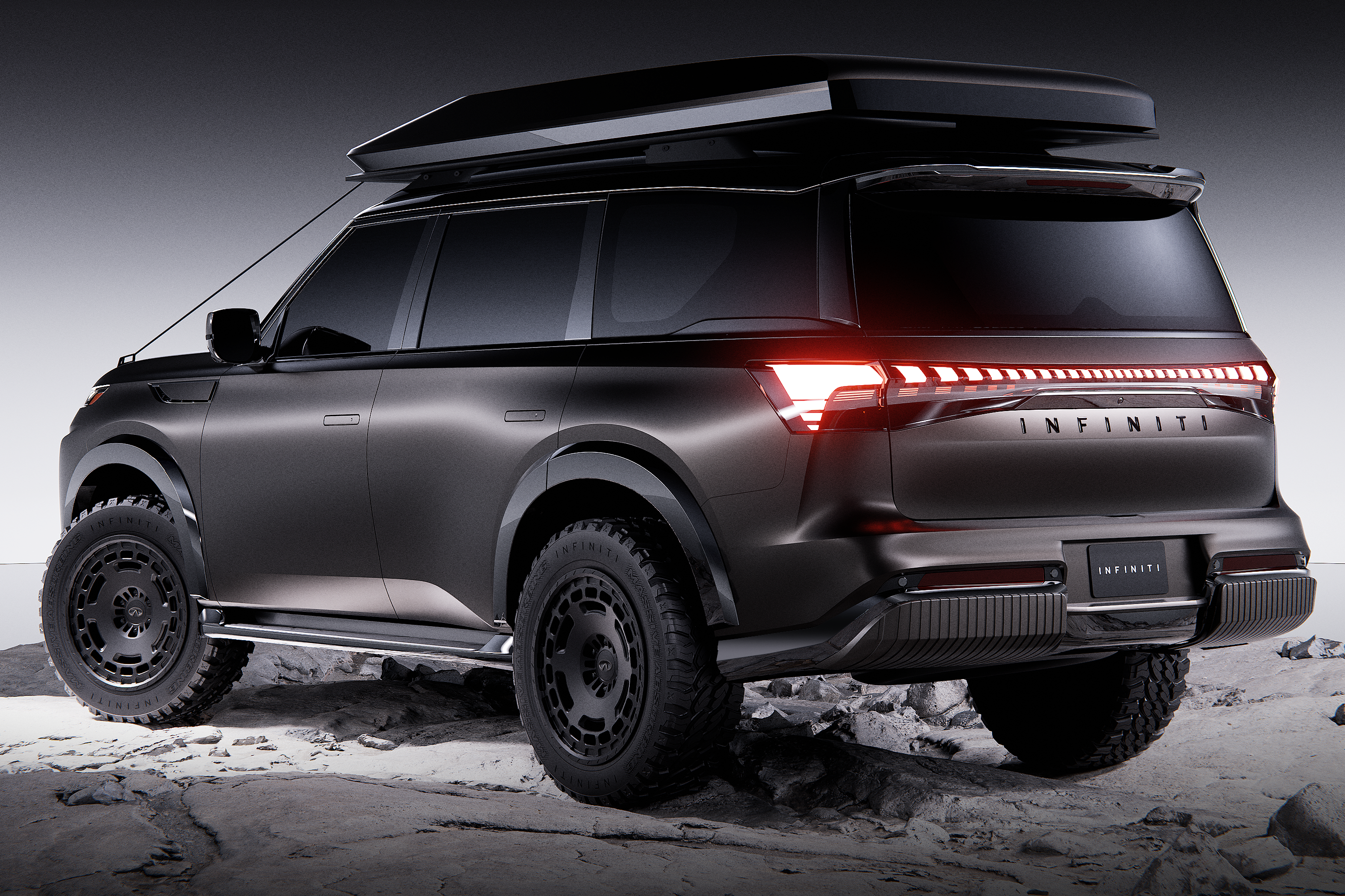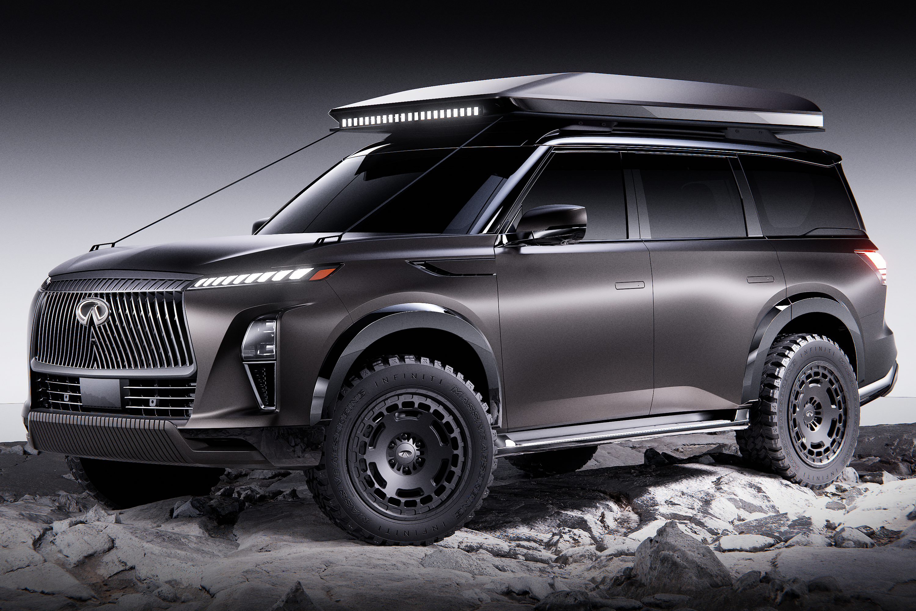 Finished in a satin dark basalt vinyl wrap, the QX80 Terrain Spec features raised suspension, all-terrain wheels and tyres and a side-exit exhaust as per the Patrol Warrior, plus a pop-up rooftop tent and lightbar, protective body cladding including beefier fender flares, and more protective covers over the lower front and rear fascias.