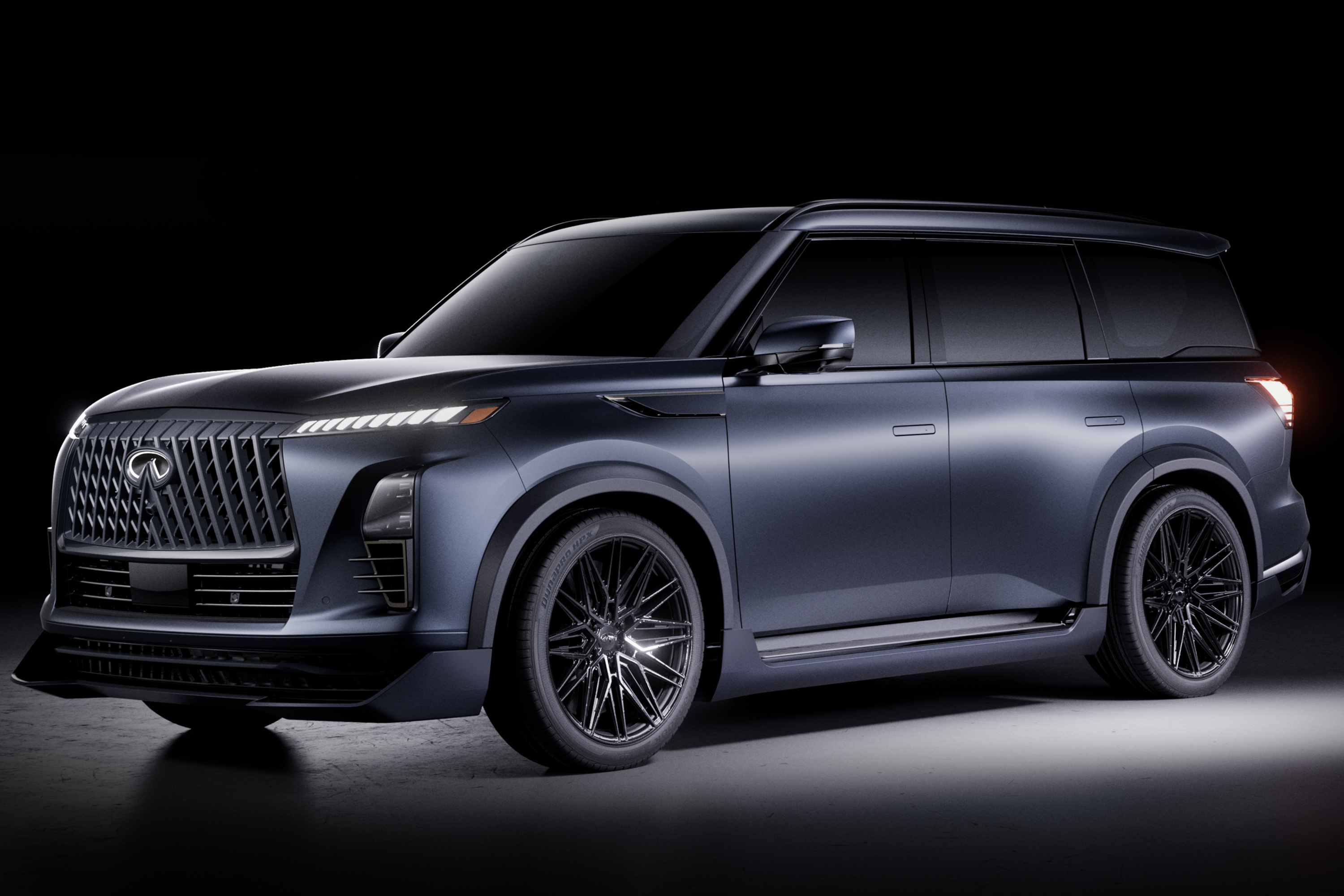 The Track Spec’s more powerful V6 is joined by larger Brembo brakes, larger 24-inch wheels and more aggressive bodywork including a unique front splitter, rear diffuser, rocker panels, fender vents, front air intakes and the grille from the new QX80 Sport variant.