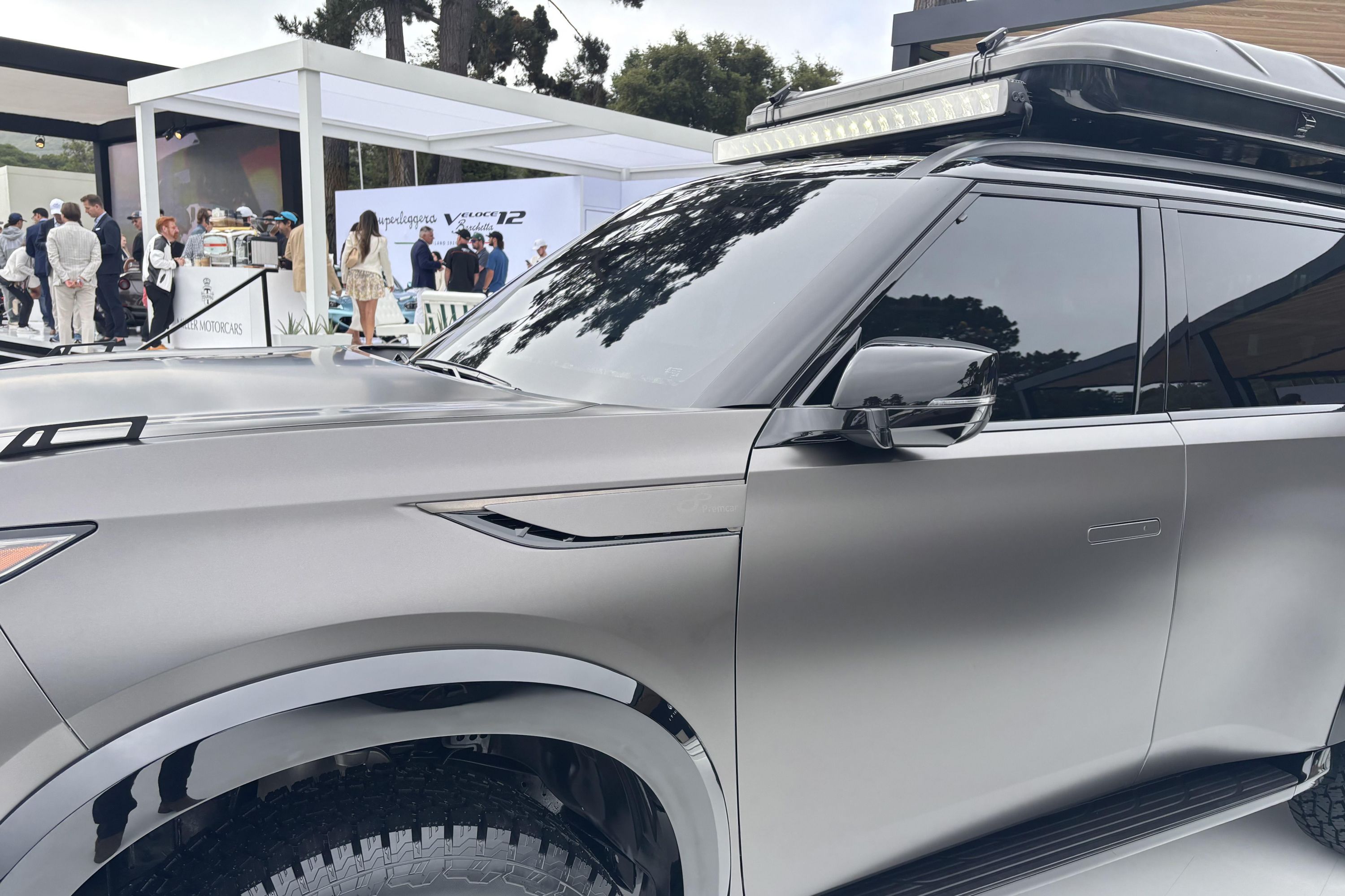 Look closely at the two detail images here and you’ll spot Premcar decals on the QX80 Terrain Spec show car, which was revealed in California on Friday at The Quail motorsport exhibition during Monterey Car Week.